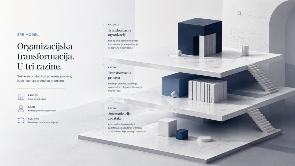 ZPR model opisuje put organizacijske transformacije kroz tri razine zrelosti i tri međusobno povezane dimenzije.